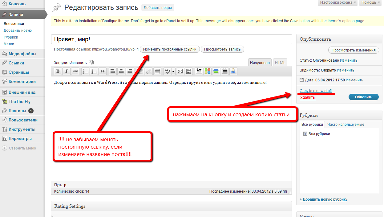 При создании дубликата статьи не забывайте в первую очередь менять постоянную ссылку новой копии. Сделать это можно в панели администрирования, выбрав редактирование необходимого поста в папке «Черновики». В качестве примера можно посмотреть на представленный выше скринсейв. Вся процедура займет у вас от силы чуть больше минуты, зато в дальнейшем вам не придется вновь возвращаться к скопированному посту, что бы исправить недочеты. Высвобожденное от этого время вы вполне можете потратить на любимое дело или попросту заняться дополнительной раскруткой сайта своими руками.