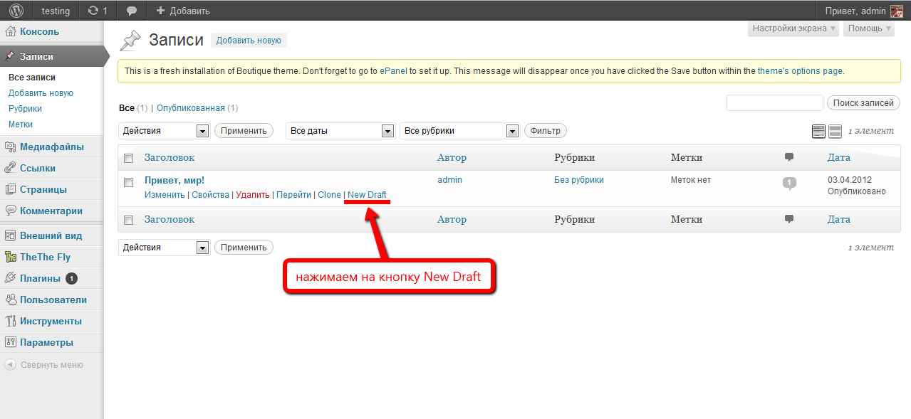 После активации плагина, в панели администрирования, в разделе меню «Все записи» (находится с левой стороны админки) вы сможете выбрать нужную статью и сделать ее дубликат. Для этого необходимо нажать «New Draft». Только что созданный дубликат появится в папке «Черновики», откуда вы сможете в любое время импортировать или скачать резервную копию. Что бы иметь более четкое представление о процессе создания дубликата, взгляните на представленный ниже скрин: